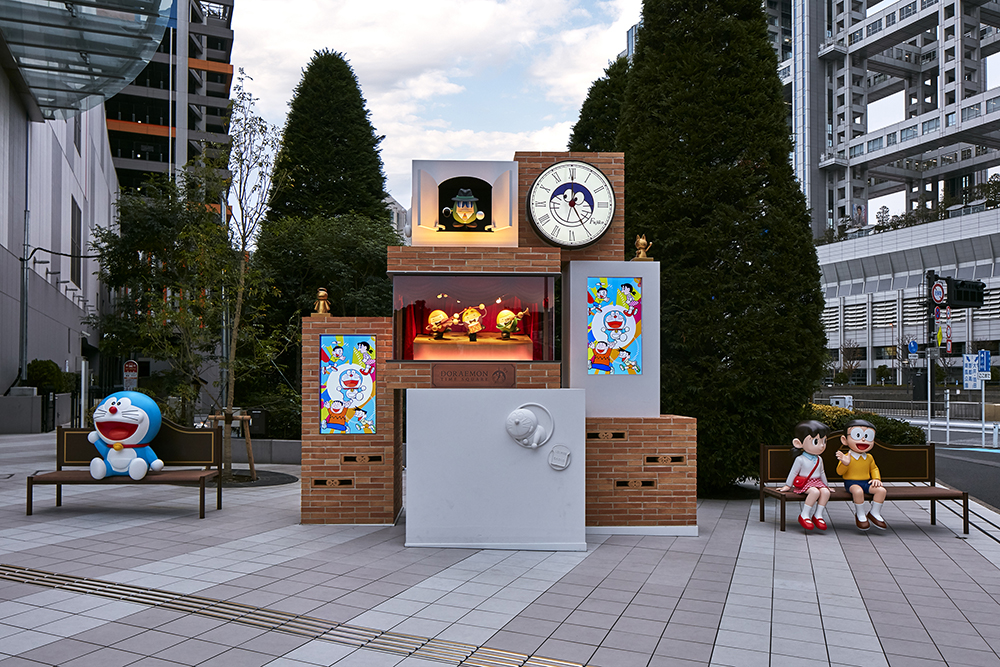 ドラえもんをモチーフにした仕掛け時計「ドラえもんタイムスクエア」。正時になると「ドラえもん」が流れ、かわいいひみつ道具たちの楽しいショーが始まります。19時からは、ムーディーなショーが楽しめます。時計の両サイドには、ドラえもんやのび太、しずかと一緒に写真が撮れるベンチもあり、フォトスポットとしてもおすすめです。